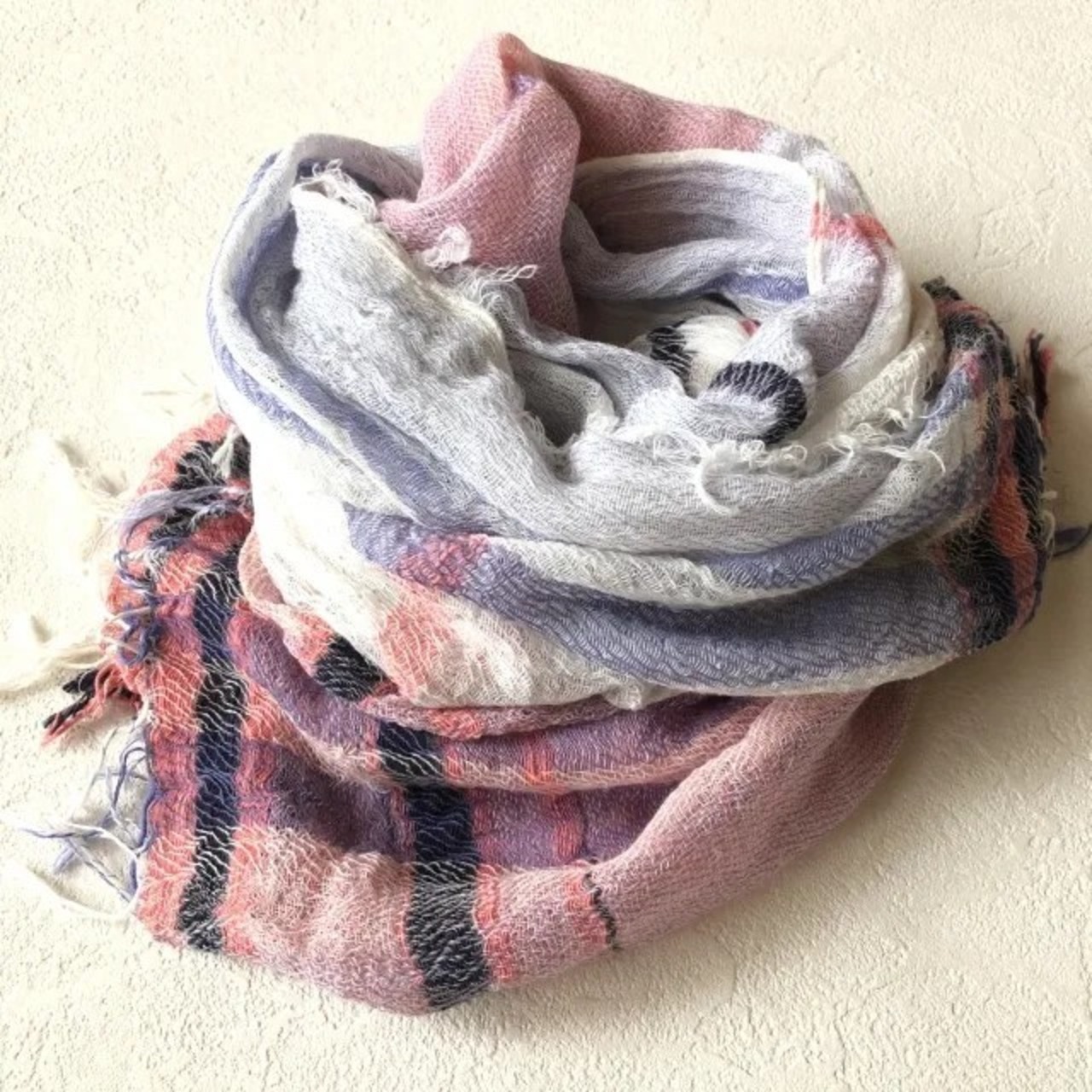 くるくるっとラフに巻くだけでもなんだかおしゃれに見えてしまうのもこのショールのもつ魅力のひとつ。