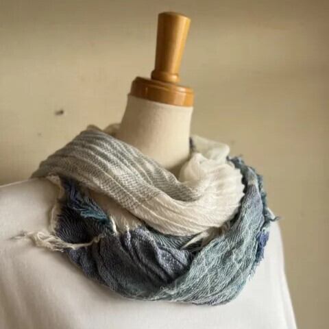 先染め糸から古い織り機や編み機を使ってオリジナルの生地を自分で作り、それを使ってショールやウェアなど唯一無二の作品を作り上げています。原料の綿花の栽培にも取り組んでいます。