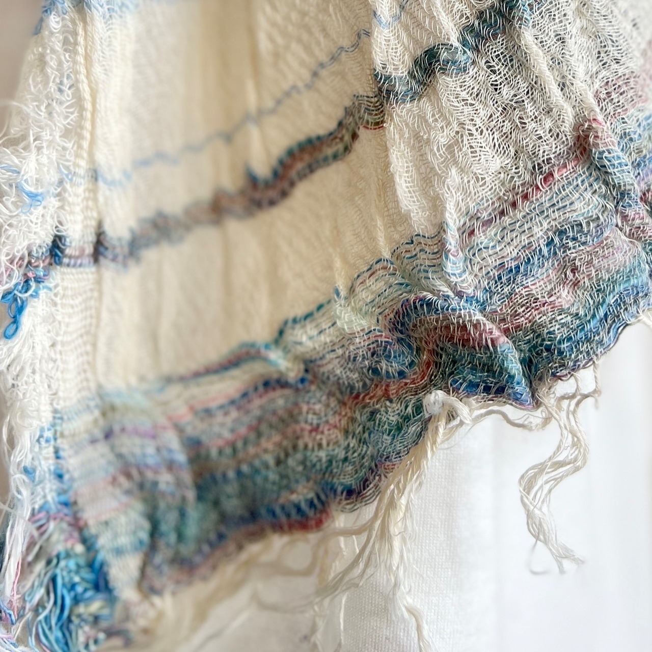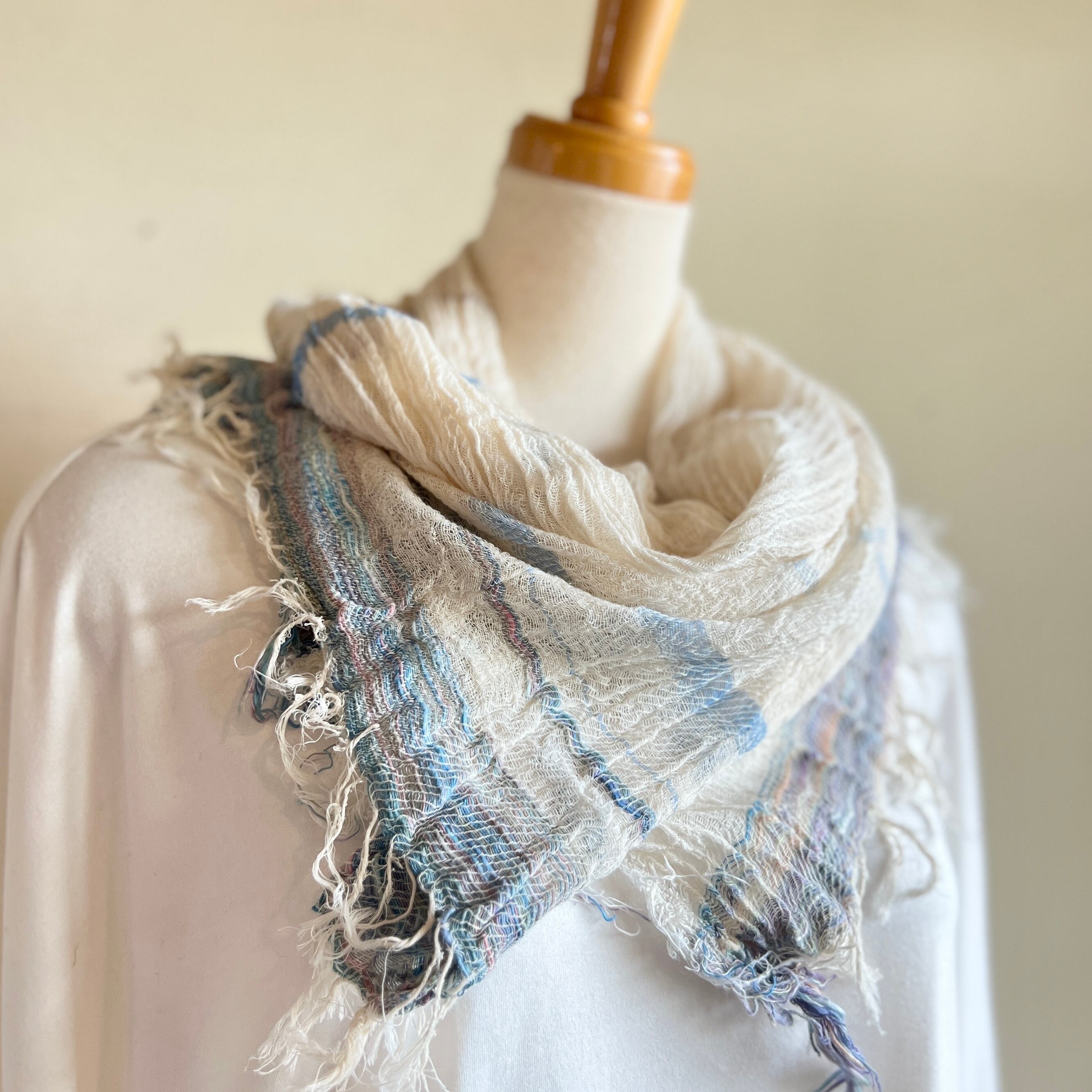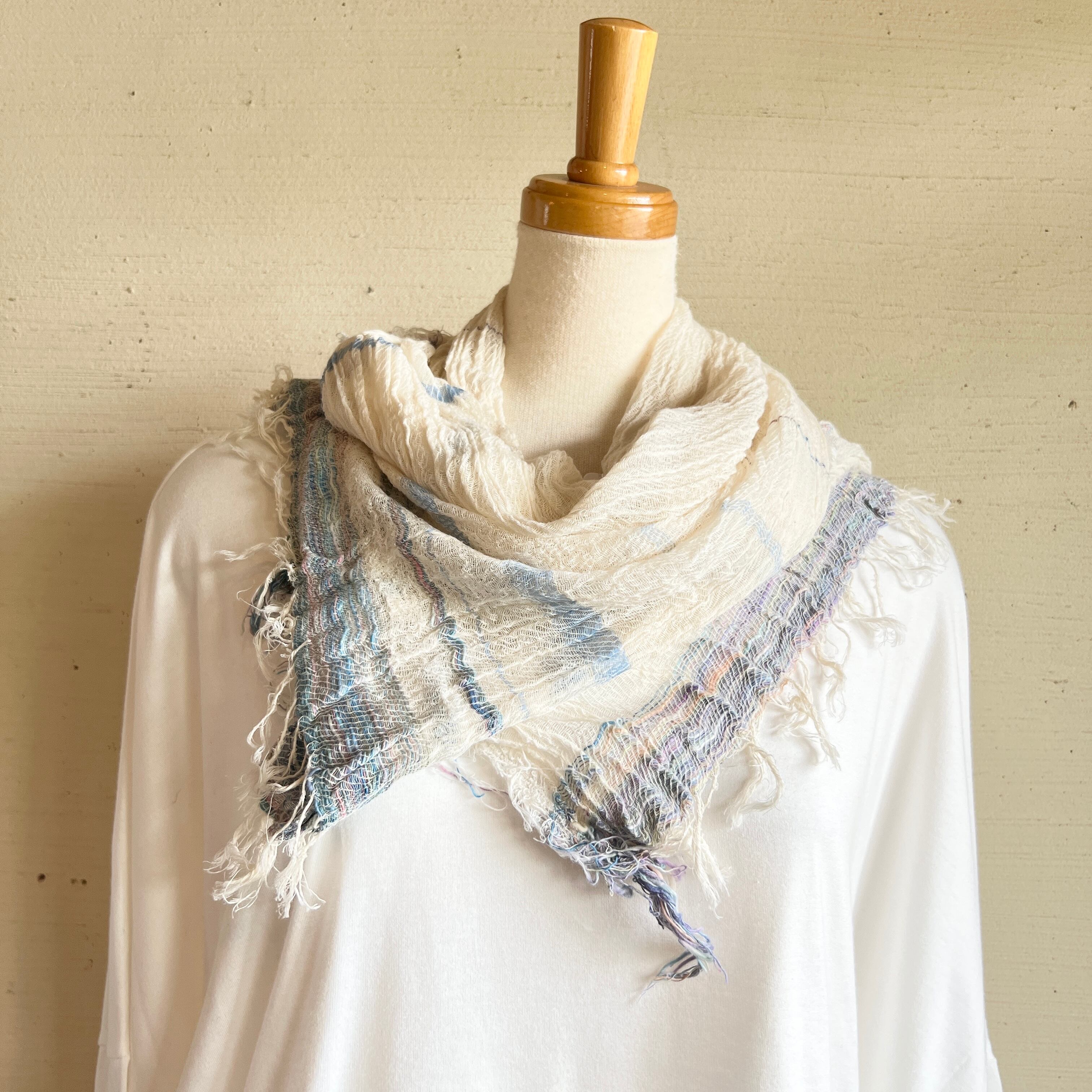手間と時間をかけ、緩やかにじっくりと織り上げていきます。できるだけゆるくゆっくりと織って、ふんわりとやさしくやわらかく。色とりどりの糸を組み合わせて生まれるショールは年齢も性別も選ばない色にあふれた世にも自由なショール。織り上がれば裁断して、一枚一枚縫製し、洗って天日に干します。洗って干し、太陽の光を浴びると、空気を含んでふっくらとやさしい柔らかさに。