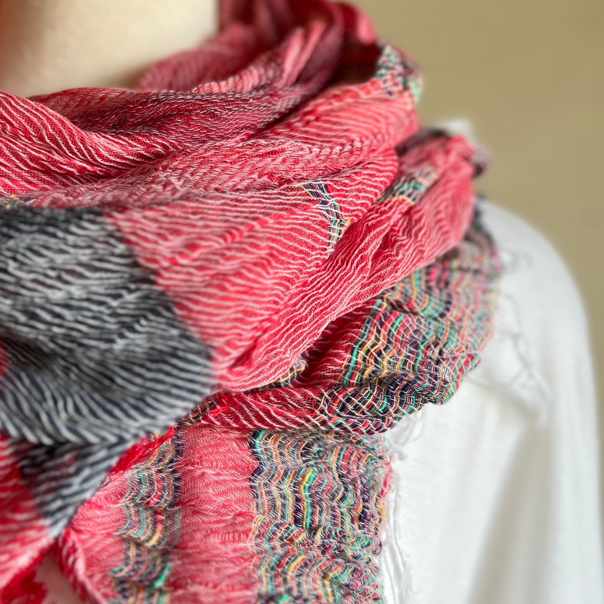 手間と時間をかけ、緩やかにじっくりと織り上げていきます。できるだけゆるくゆっくりと織って、ふんわりとやさしくやわらかく。色とりどりの糸を組み合わせて生まれるショールは年齢も性別も選ばない色にあふれた世にも自由なショール。織り上がれば裁断して、一枚一枚縫製し、洗って天日に干します。洗って干し、太陽の光を浴びると、空気を含んでふっくらとやさしい柔らかさに。