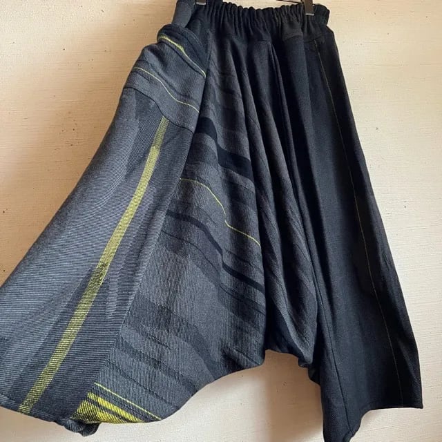 生地をタテ・ヨコ・ナナメに大胆に組み合わせた、遊び心のあるサルエル風のパンツ。
