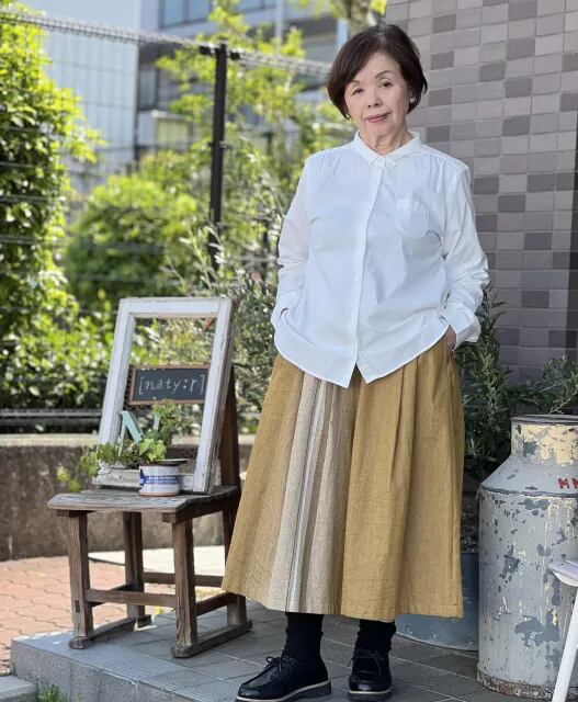 tamaki niimeが織る生地は、ショールで作り上げたイメージを土台として、着心地の良さを限界まで追求したものです。一般的な綿の生地とは違う、なめらかで肌触り良い質感は、数本の細い糸を一本の糸として用いる工夫によって実現され、どの服もやさしく体を包み込むような肌触り。一度着ると、心地よさからまた着たくなる生地感です。柄と配色の組み合わせは全てが異なる一点ものです。
