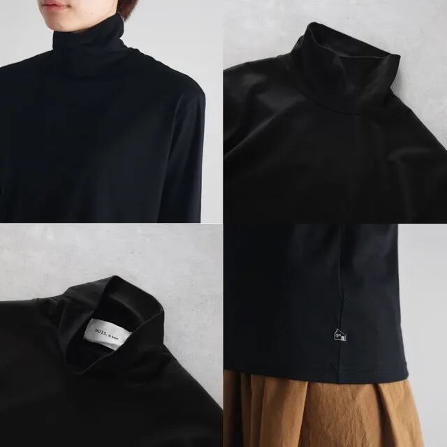 一般的なタートルネックと異なり、ネックの後ろの部分に切り替えがないシームレスデザインとなっています。後ろ見頃からひとつづきに立ち上がることにより、襟が立ちやすく、首にそってよりスッキリと見えるオリジナルのシルエットとなっています。