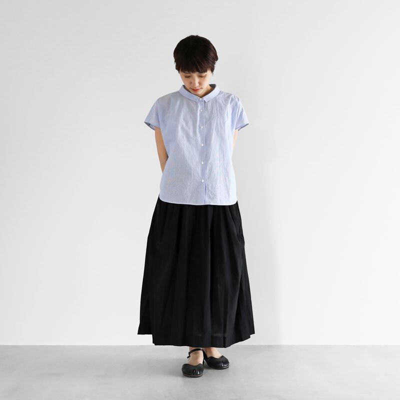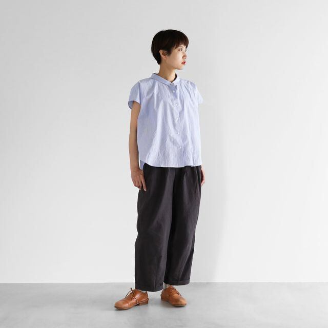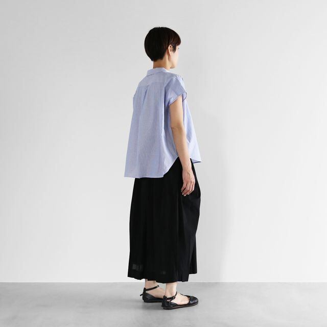 デザインは、身幅を大きくとったワイドシルエットのブラウスに仕上げ、袖は少し肩にかかるフレンチスリーブとなっています。
