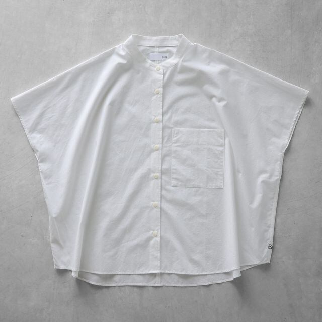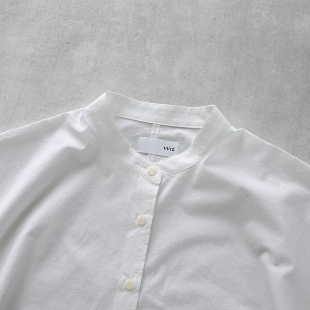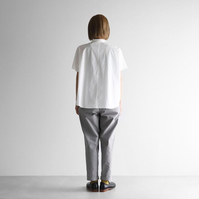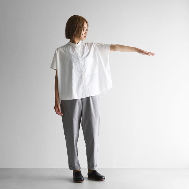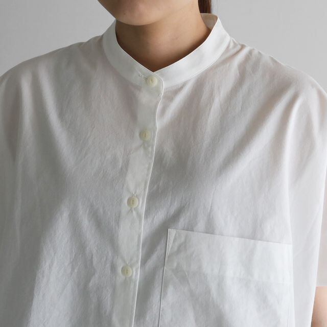少しカジュアルな印象のバンドカラーのブラウスで、わずかに立ち襟になったパターンのため首周りをすっきりと見せてくれます。