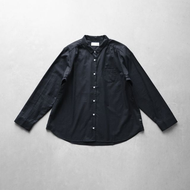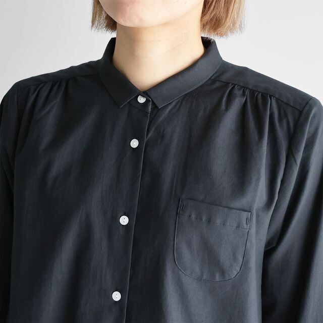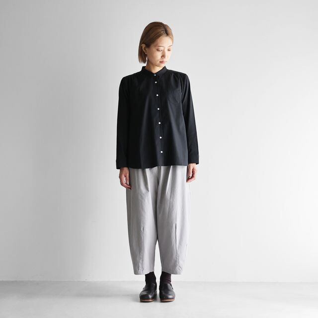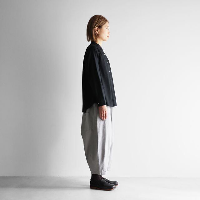 デザインは、身幅を大きくとったワイドシルエットのブラウスに仕上げ、肩の落ちる自然なAラインが生まれることで、スッキリとした印象のシルエットで着ていただけます。