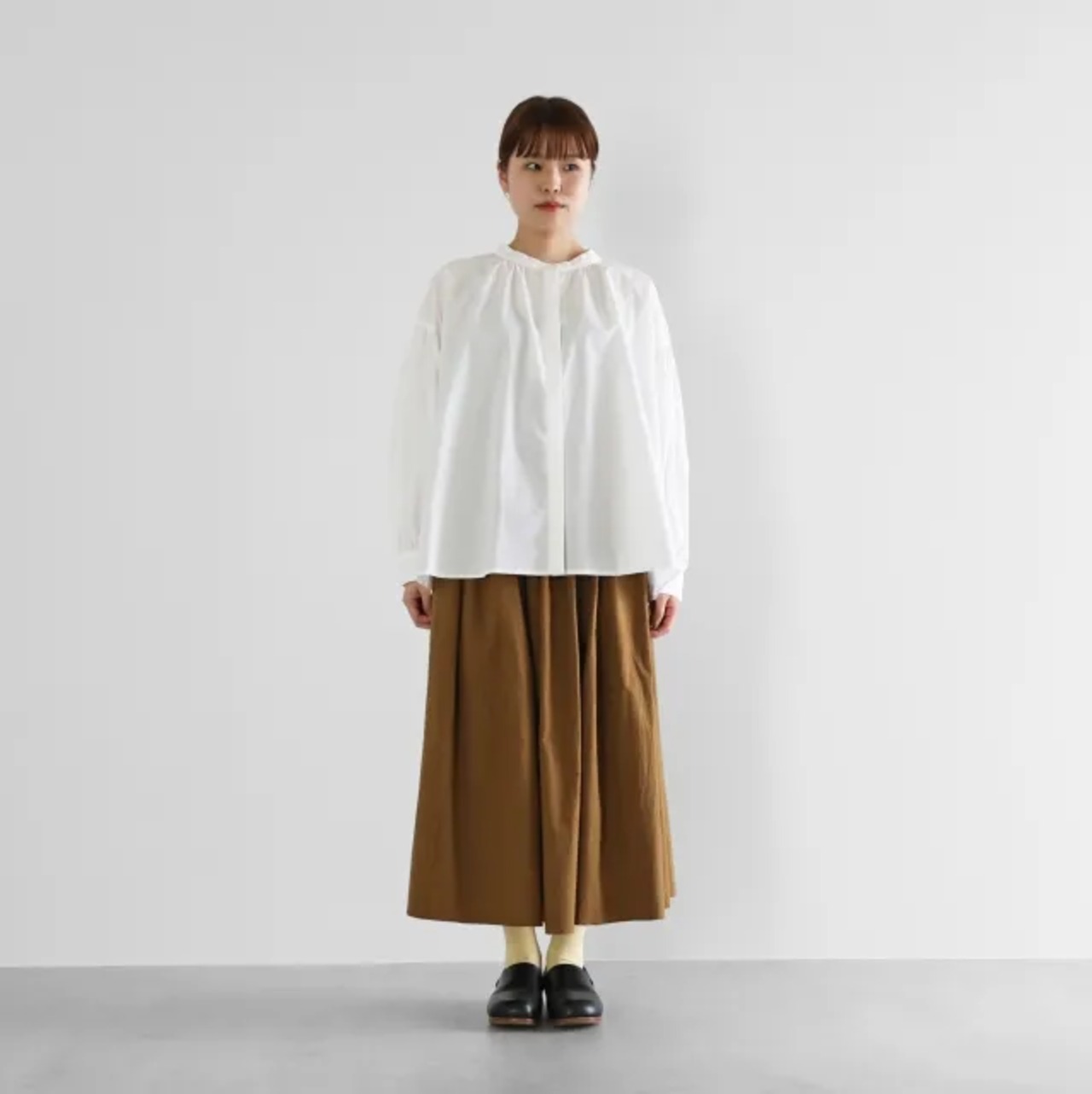 前合わせは隠しボタンになった比翼型で、首回りのやわらかなギャザー感もポイントです。