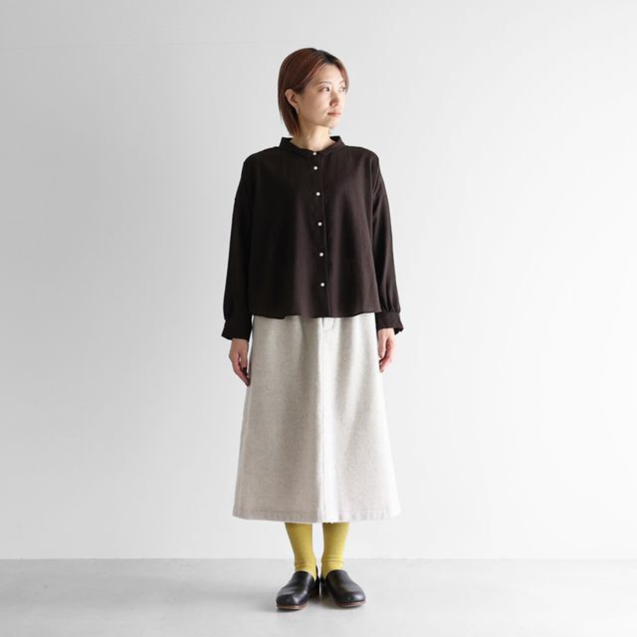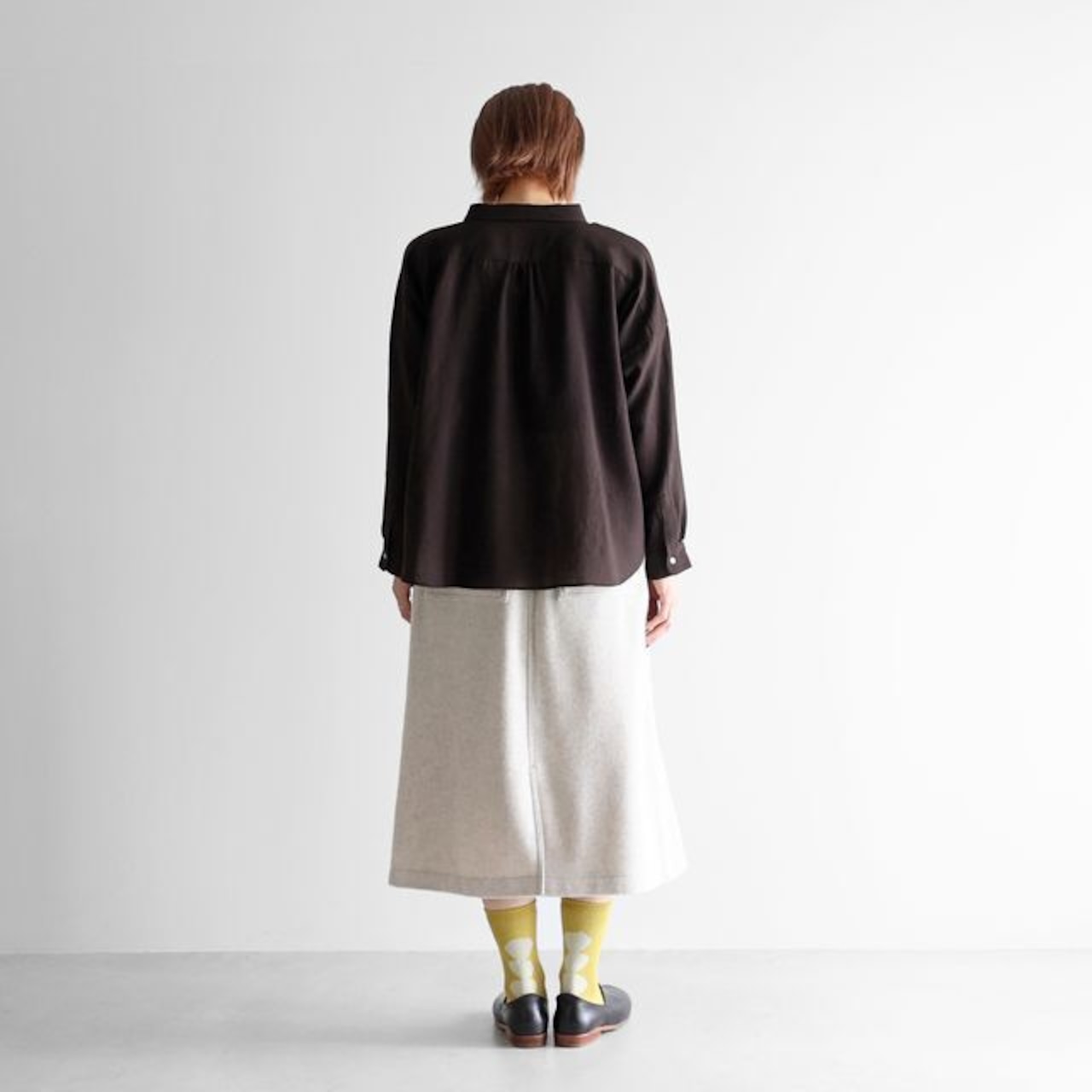 希少なウール100%のブラウスは、外を覆い閉じ込めていただくとあたたかな空気の層を作るウールの保温性が抜群に発揮され、冬場を通してあたたかく着ていただくことができます。