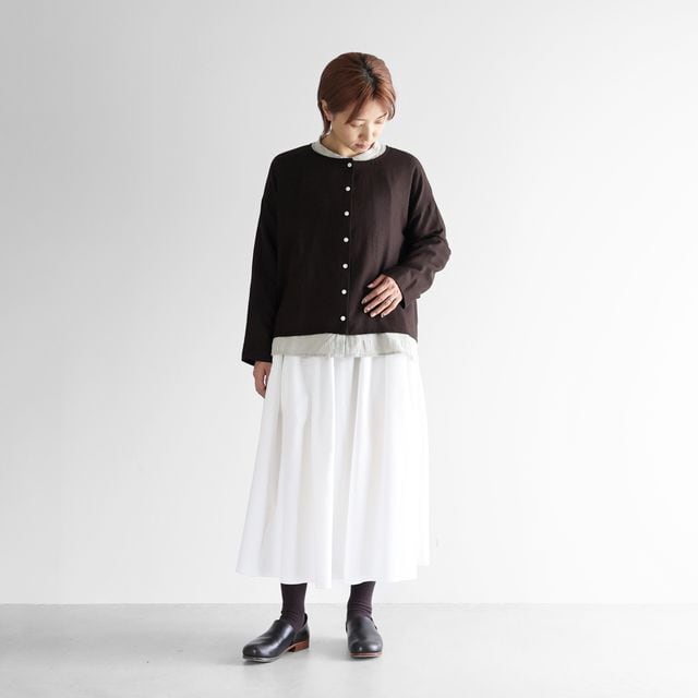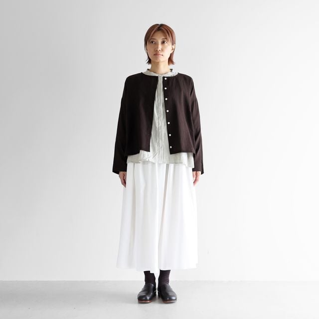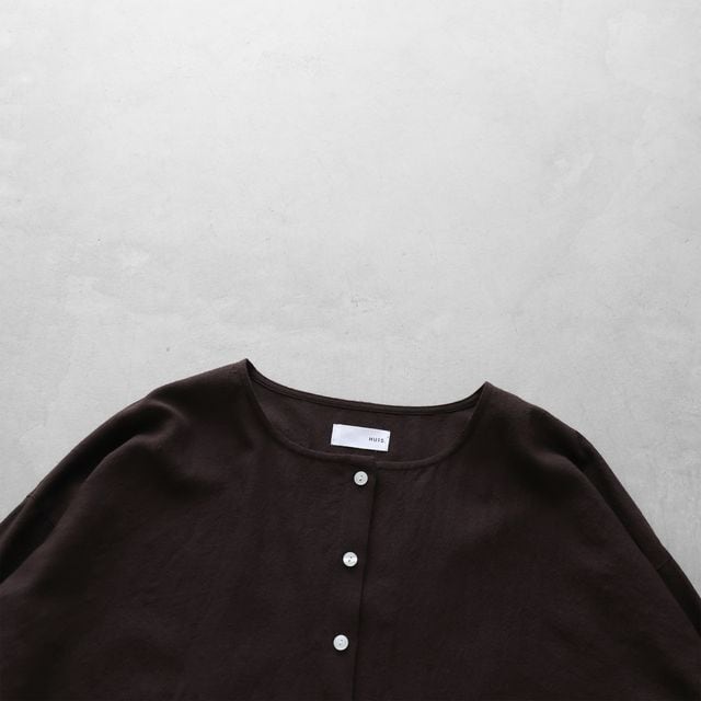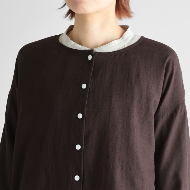 ウール素材は、着ていると体の熱を吸って溜め込んでいきます。ウール100%のこちらのブラウスは、着ているとポカポカと暖かくなってくるもので、前を開けて羽織っていただければ、秋口・春先のカーディガンのように羽織りものとして重宝していただけます。