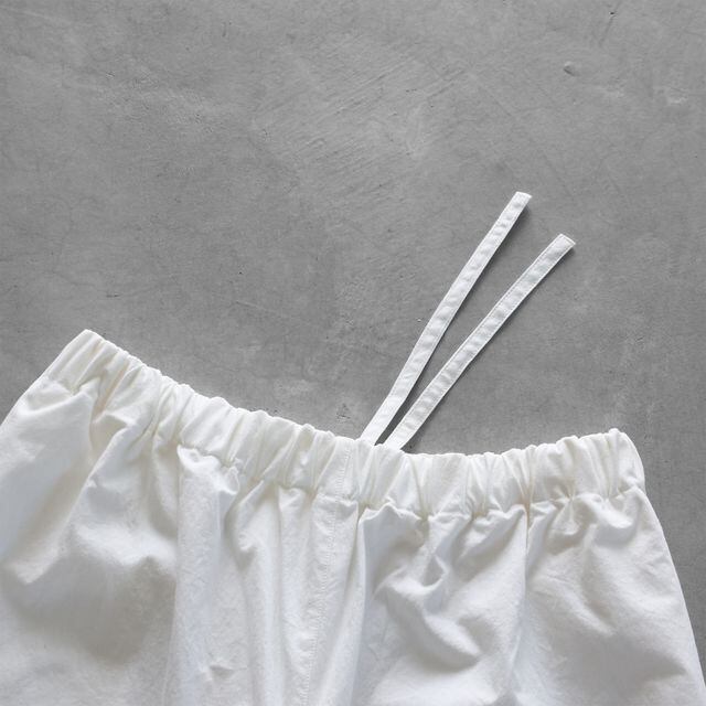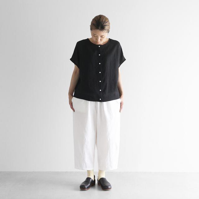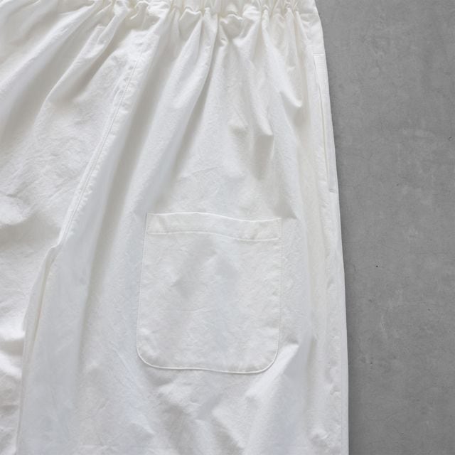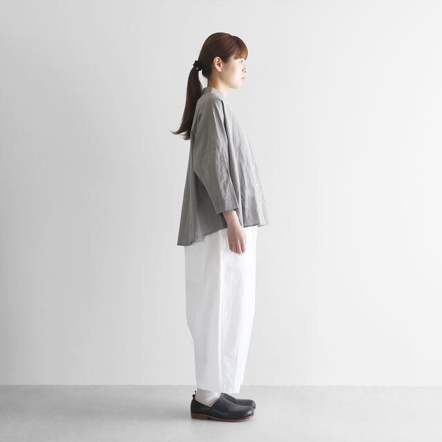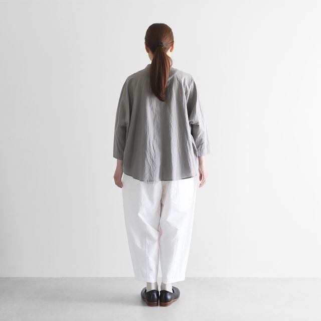 もも周りにたっぷりと生地を使用したバルーンパンツで、裾に向けてテーパードがかかったきれいなラインのシルエットです。8〜9分丈くらいの丈感で、少しロールアップして履いていただくのもおすすめです。右後ろについた下がり気味のポケットがポイント。