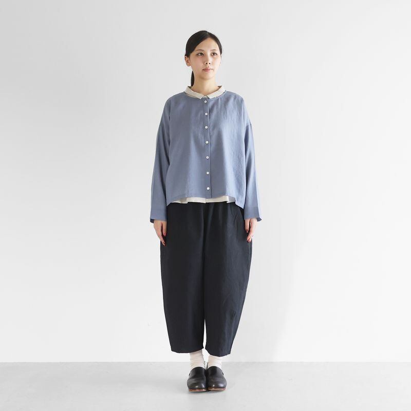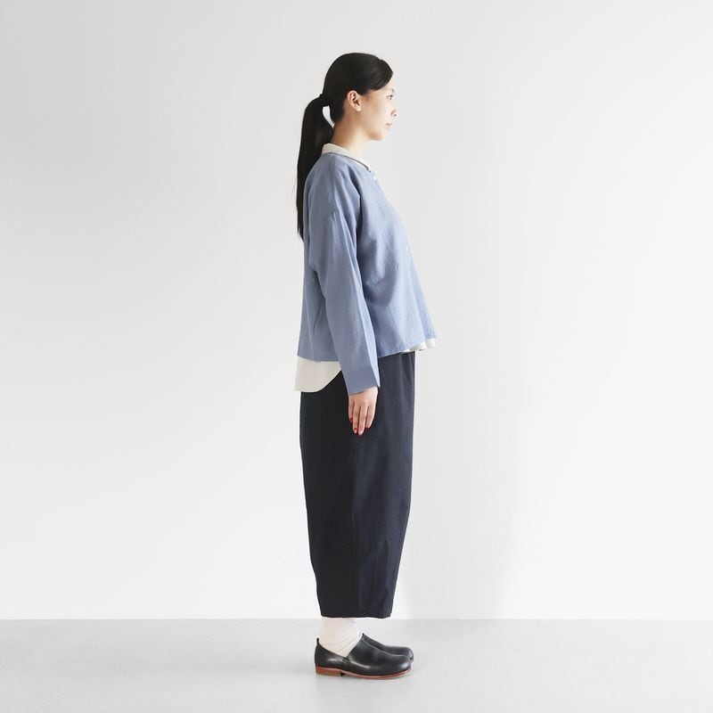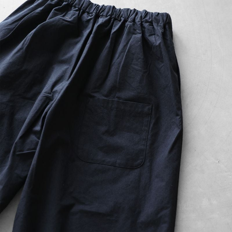 もも周りにたっぷりと生地を使用したバルーンパンツで、裾に向けてテーパードがかかったきれいなラインのシルエットです。8〜9分丈くらいの丈感で、少しロールアップして履いていただくのもおすすめです。右後ろについた下がり気味のポケットがポイント。