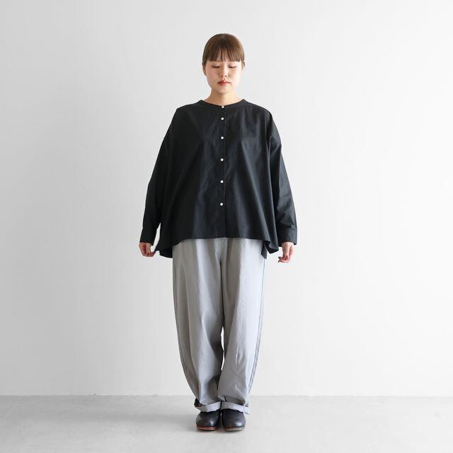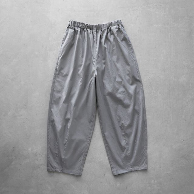 もも周りにたっぷりと生地を使用したバルーンパンツで、裾に向けてテーパードがかかったきれいなラインのシルエットです。8〜9分丈くらいの丈感で、少しロールアップして履いていただくのもおすすめです。右後ろについた下がり気味のポケットがポイント。