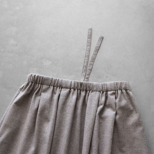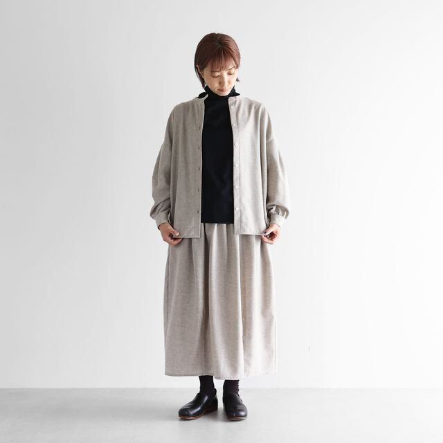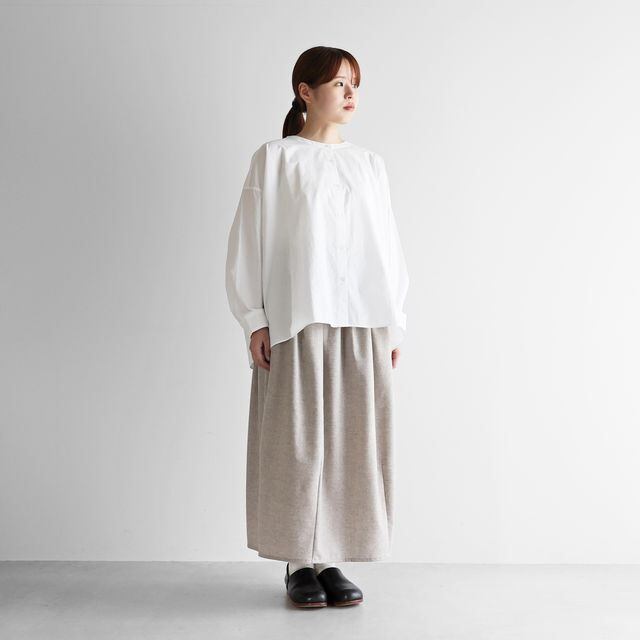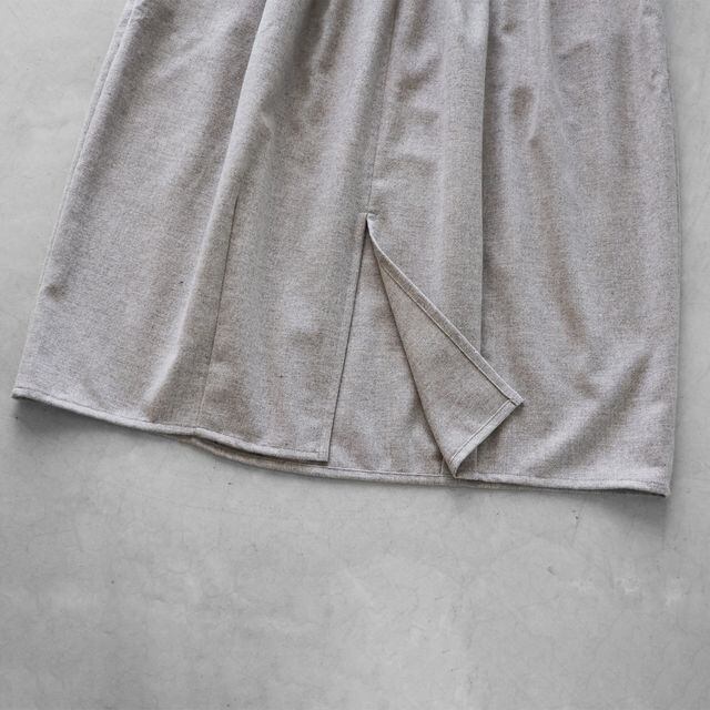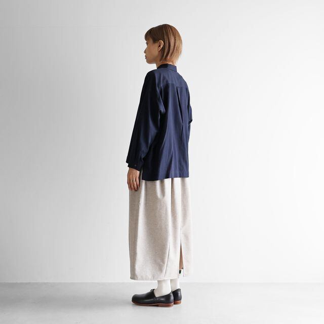 デザインは、生地をたっぷりと使ったシンプルなプレーンスカートですが、丈裾にタックを入れることによって生まれる、自然な丸みのあるコクーンシルエットが特徴。スリットが入っているため、足さばきにもストレスがありません。