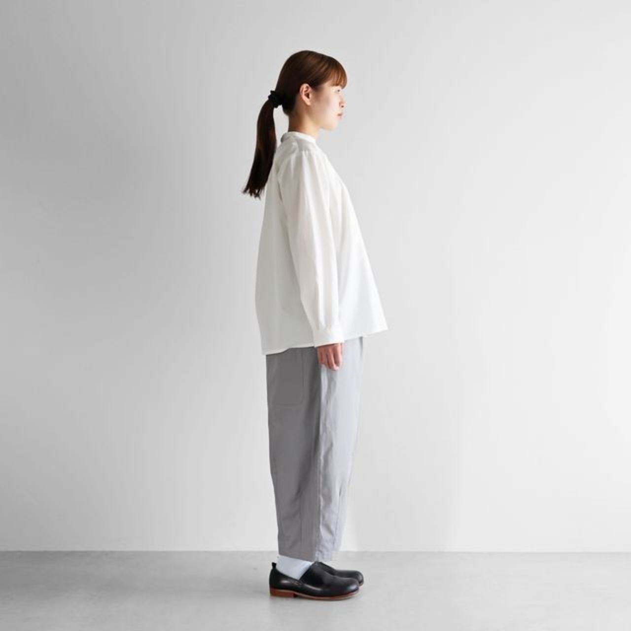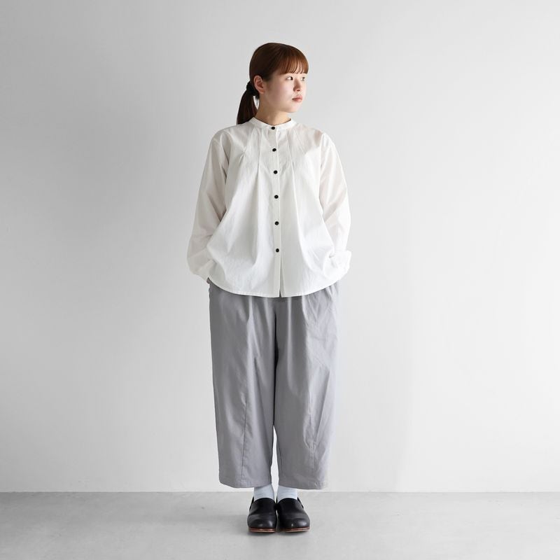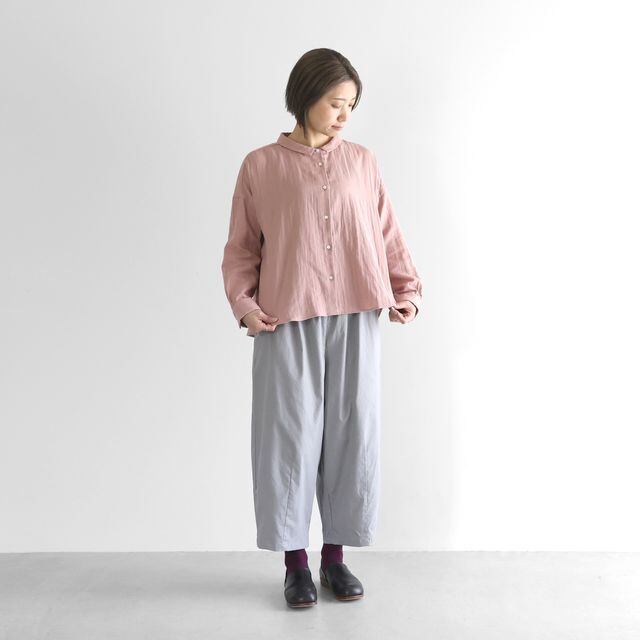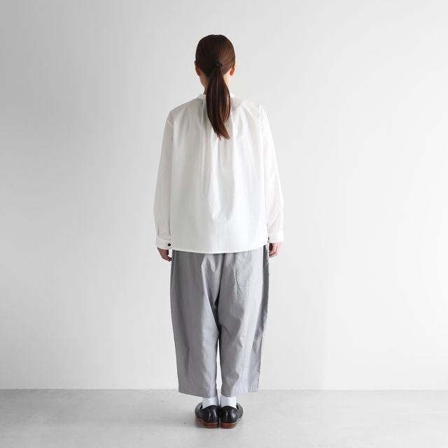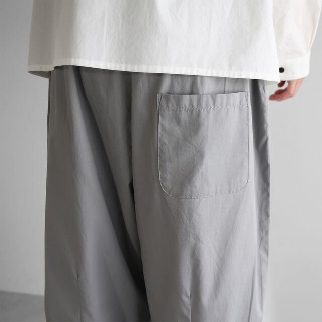 もも周りにたっぷりと生地を使用したバルーンパンツで、裾に向けてテーパードがかかったきれいなラインのシルエットです。8〜9分丈くらいの丈感で、少しロールアップして履いていただくのもおすすめです。右後ろについた下がり気味のポケットがポイント。