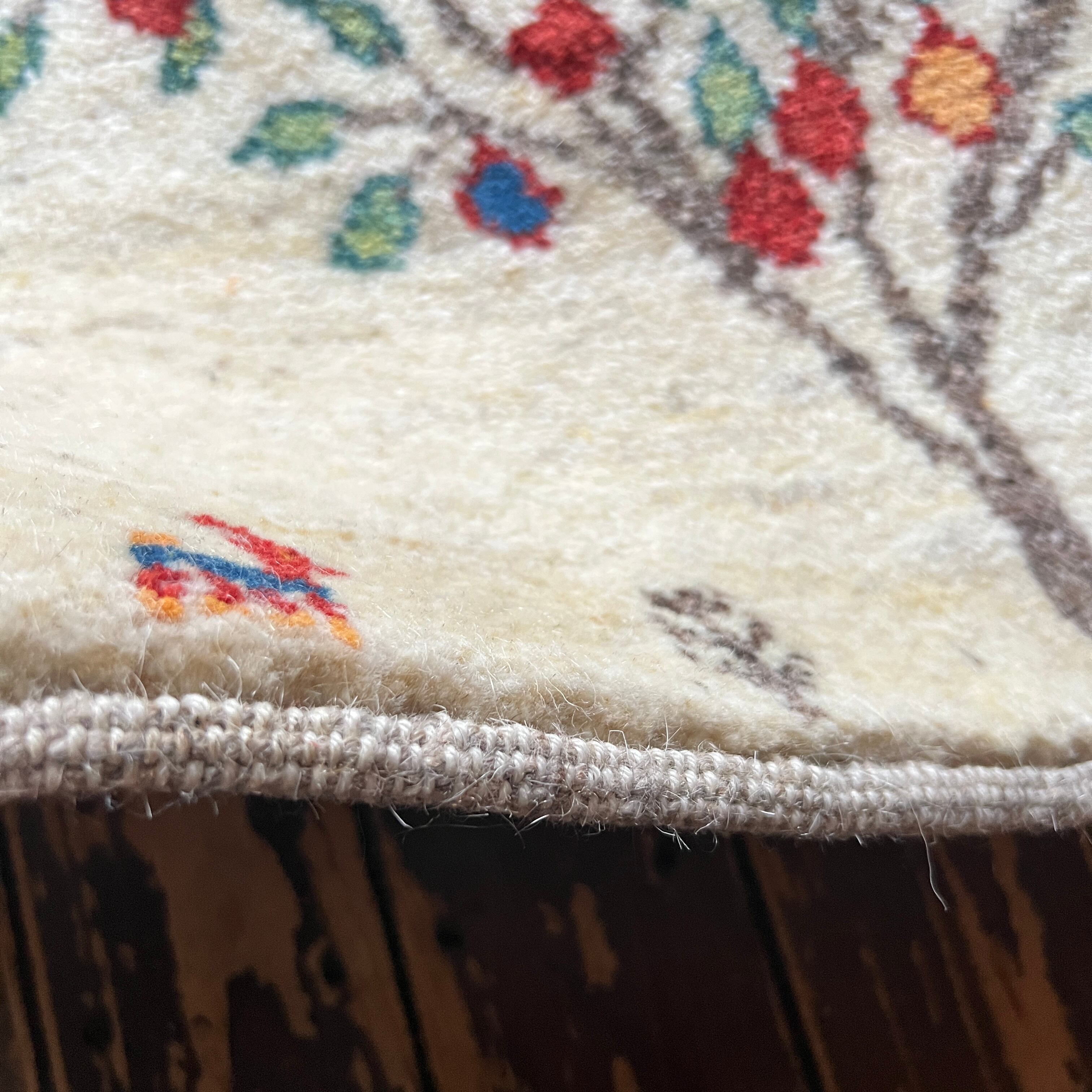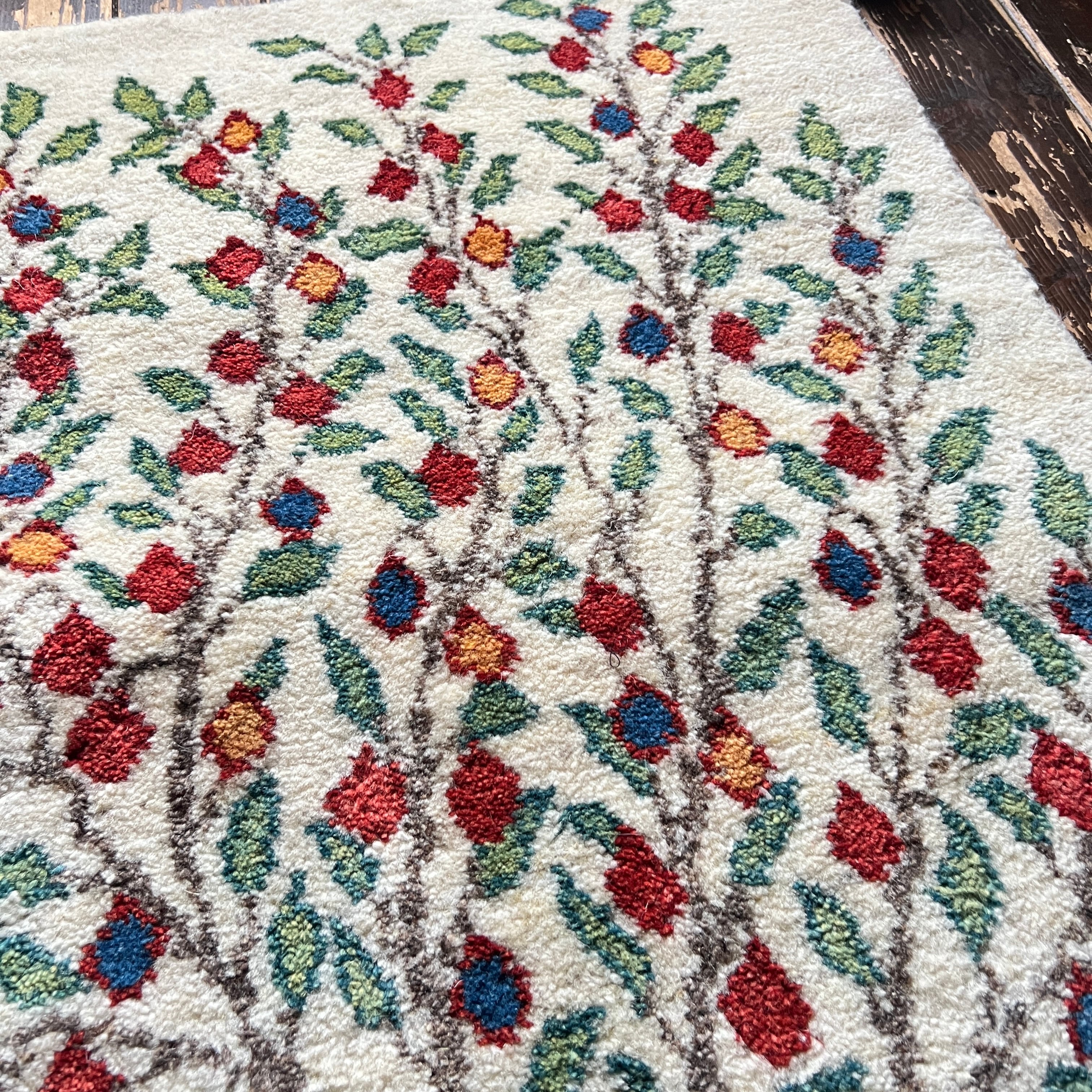 ベースは原毛そのままの色を活かしたベージュカラー。そこにギャッベで代表的な文様