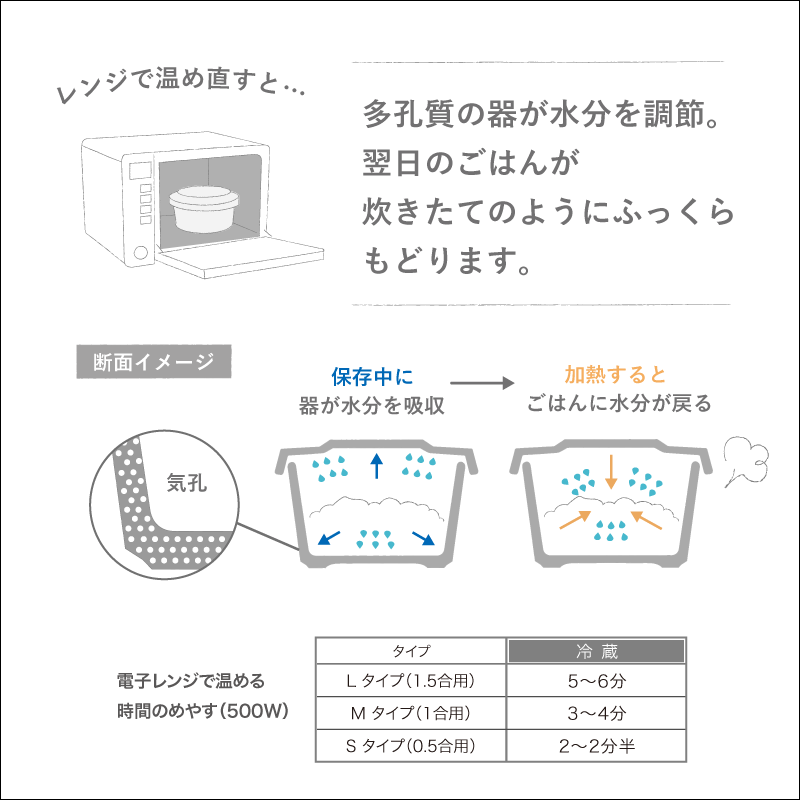 水分をごはんに戻すオイシイしくみ。冷凍も可能。