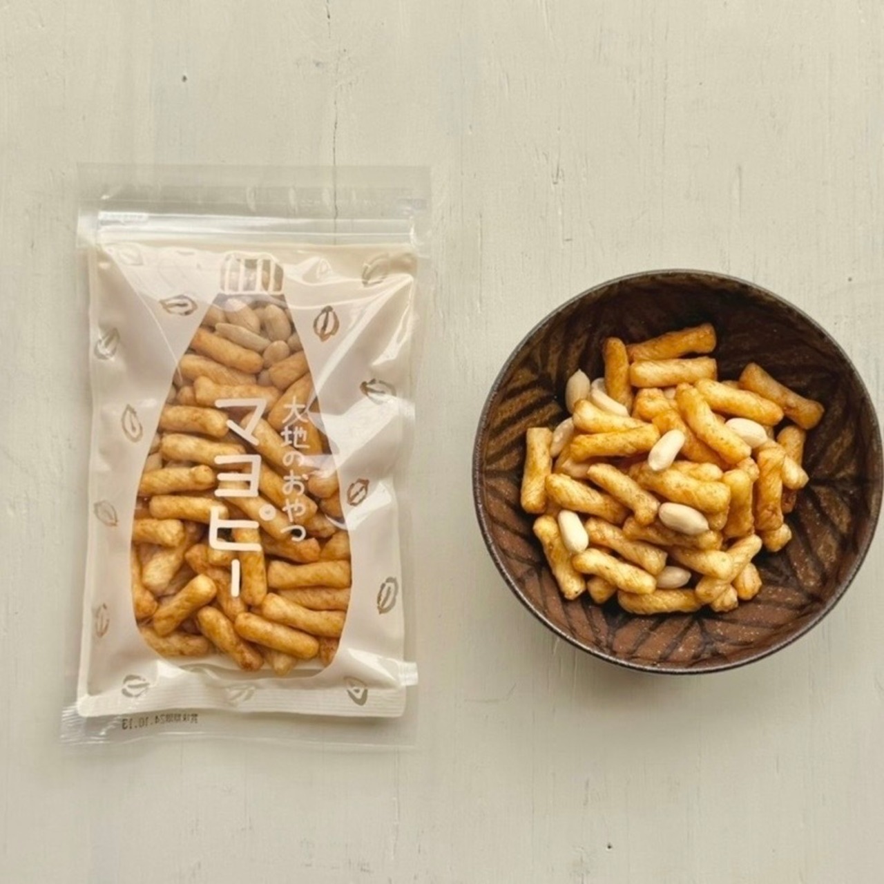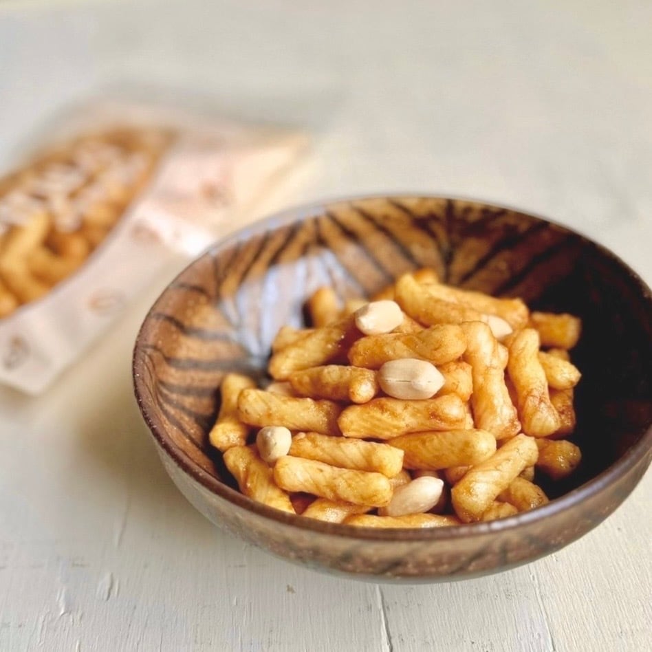 マヨネーズ味のあられと有機ピーナッツを組み合わせた、その名も “マヨピー”。精米したての国産もち米を使って焼き上げたサクッと軽い食感の生地に、自然の味そのまんまマヨネーズ、小麦を使わない国産丸大豆たまり醤油、粗糖をからませた特製マヨあられ。マヨネーズのほどよいコクと酸味に醤油と粗糖がほんのり効いた和風の味わいです。そこに、少し塩味のある大粒で風味豊かな有機ピーナッツをカリッとひと噛み。何ともくせになるおいしさです!