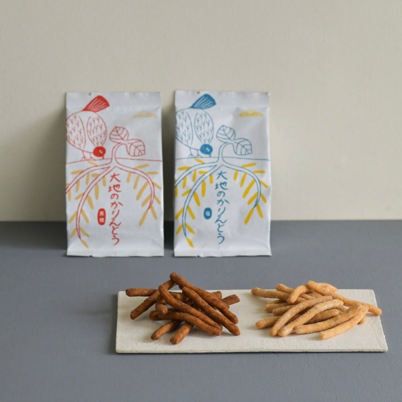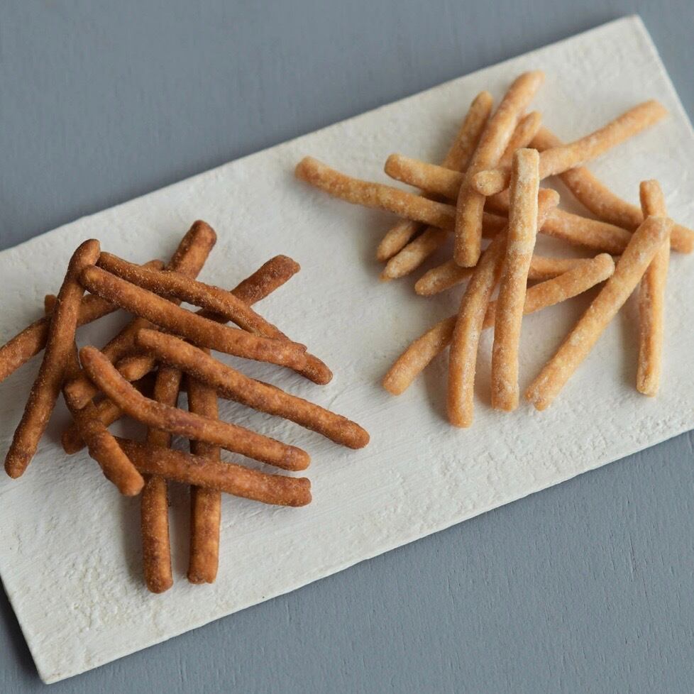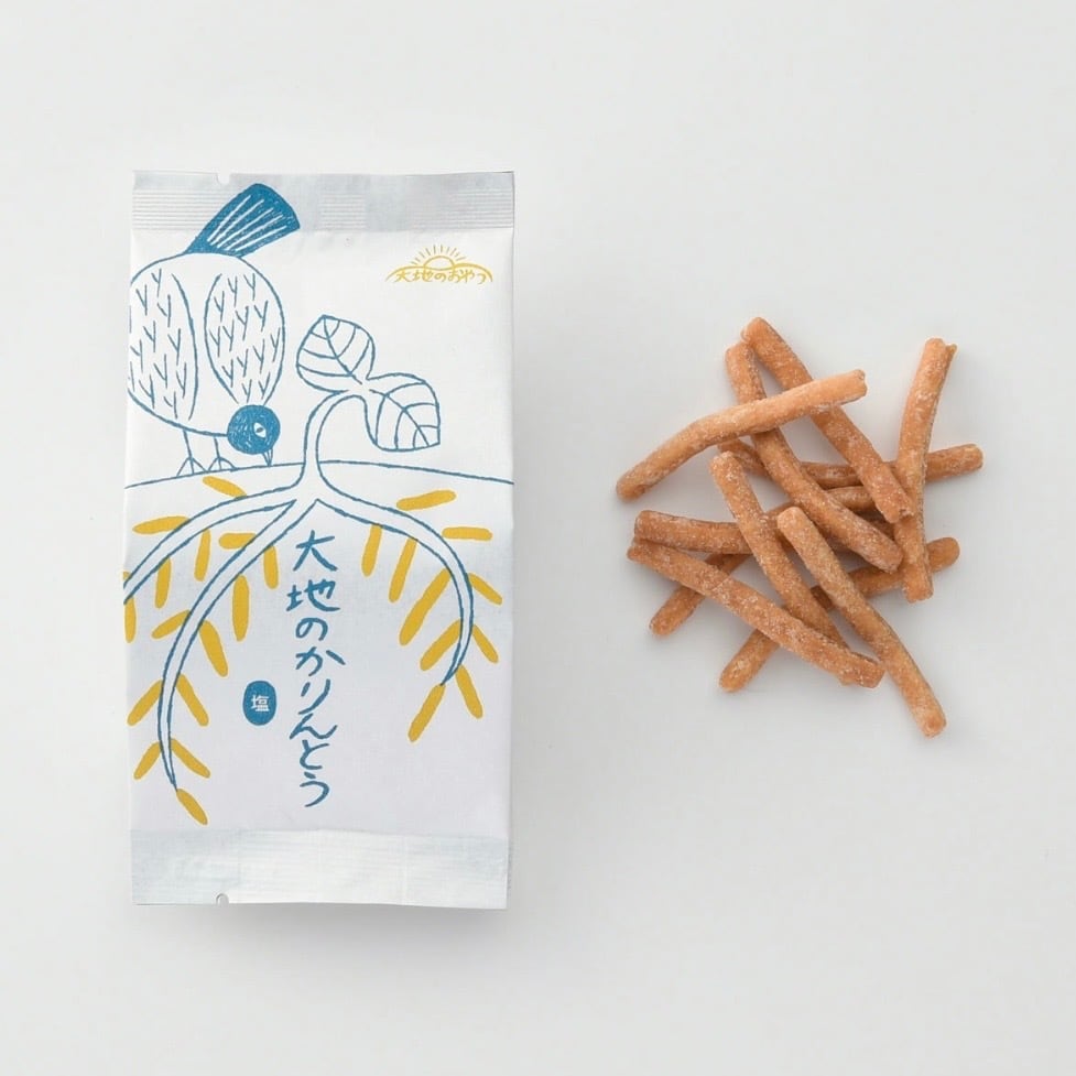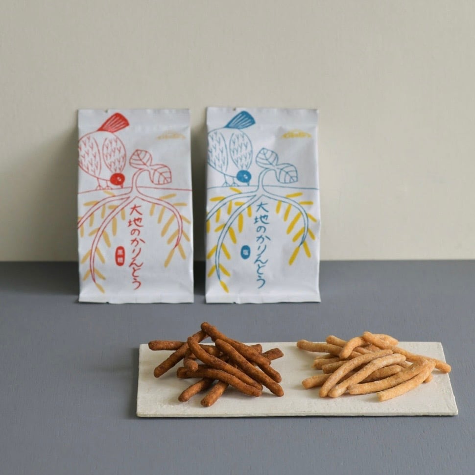 北海道産石臼挽き小麦全粒粉、岐阜県産小麦粉、 平飼い有精卵、粗糖などの厳選素材を使用し、 純国産米油で一本一本ていねいに手揚げした “大地”のように力強くて優しい 素材感あふれるかりんとうです。 純黒糖の素朴で優しい甘さが広がる「黒糖」、 素材のおいしさを岩塩が引き立てる「塩」の 2種類がございます。