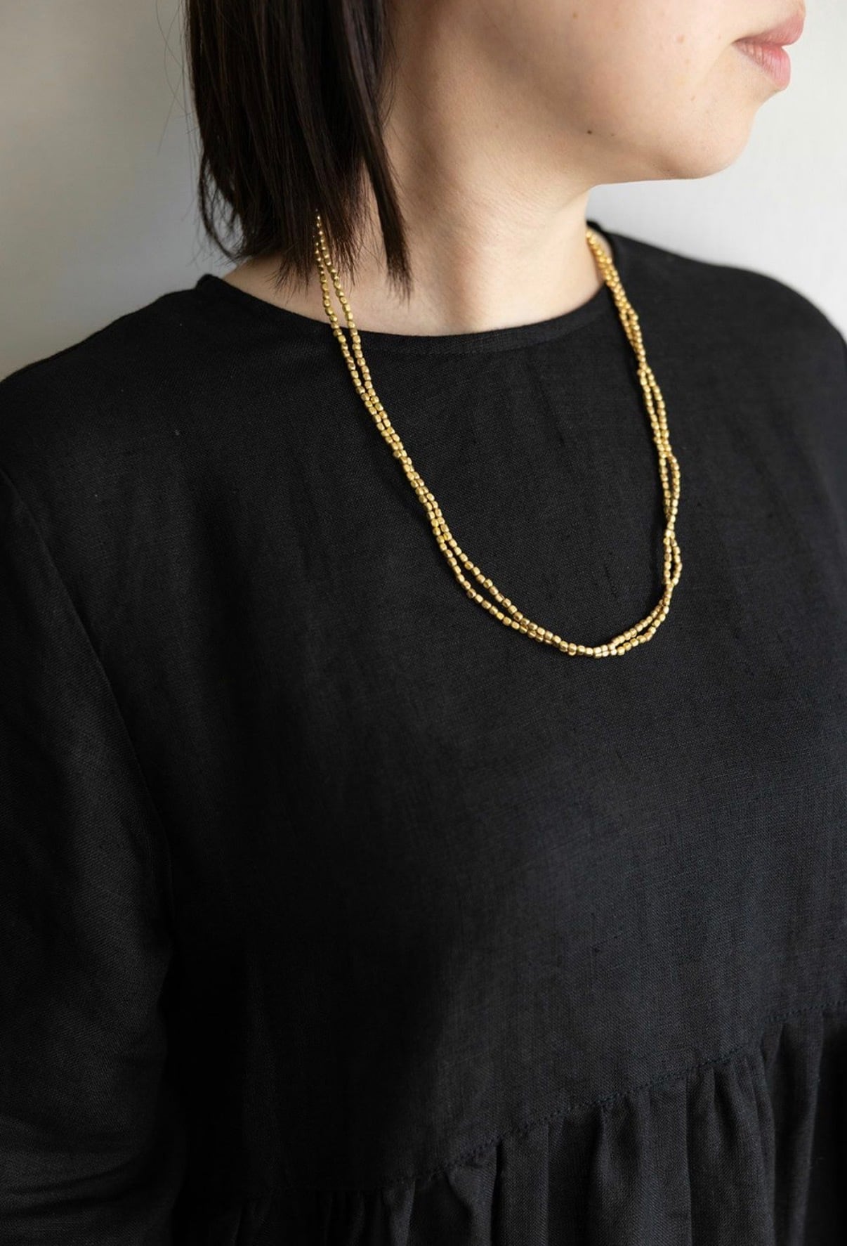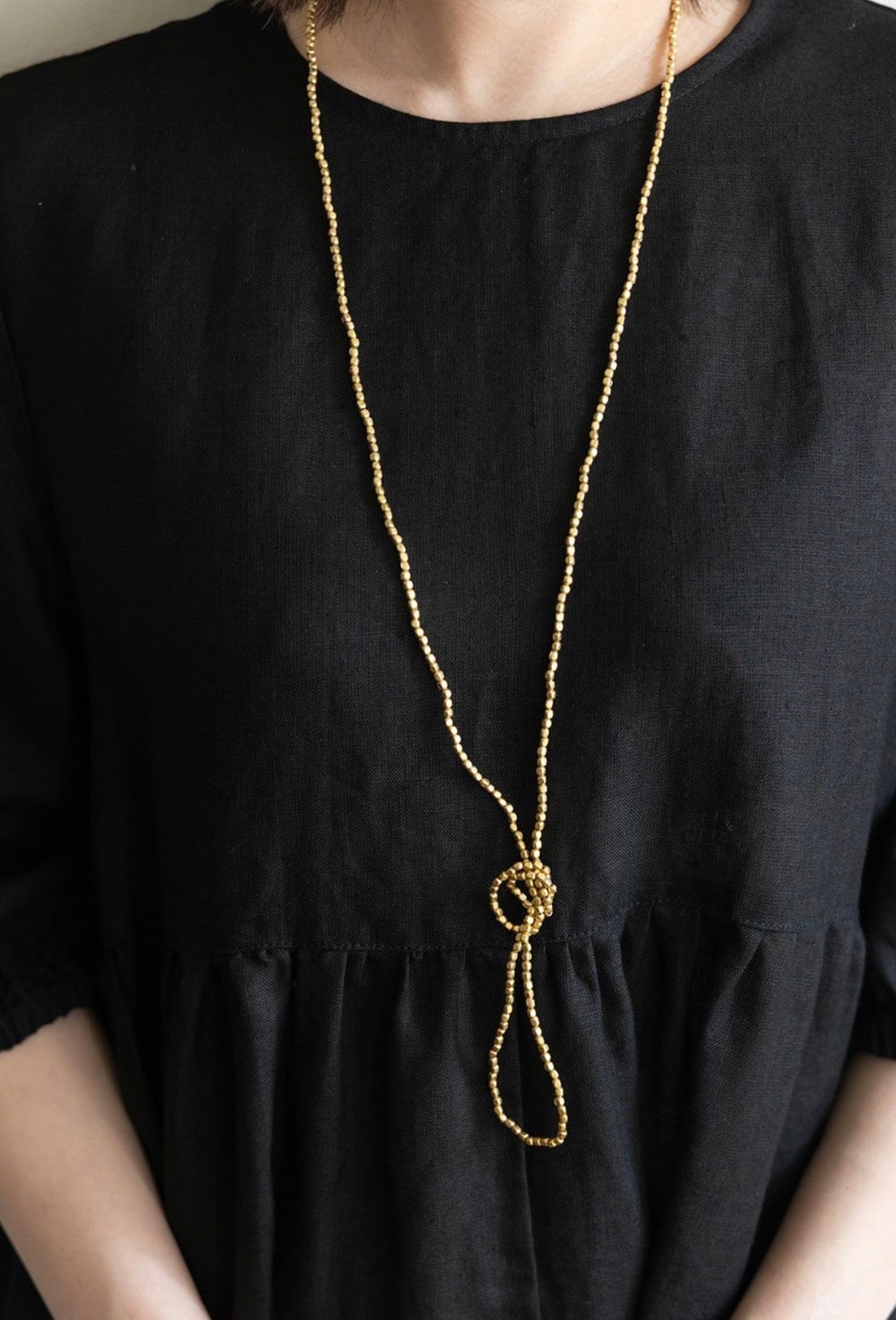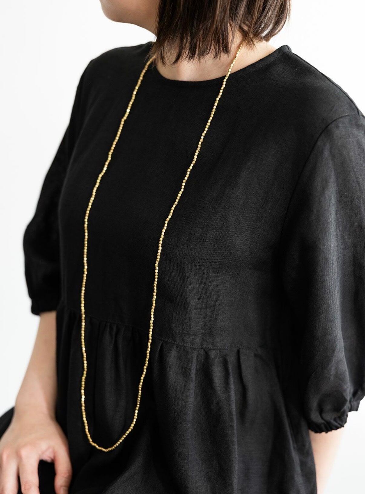 ロングタイプのネックレスは、ダブルにして首元を華やかに彩ったり、何重にもしてブレスレットとして使ったり。コーディネートによって、いろいろな付け方をお楽しみ頂けます。シンプルにTシャツやリネンのワンピースと合わせて、デイリーにお使いください。