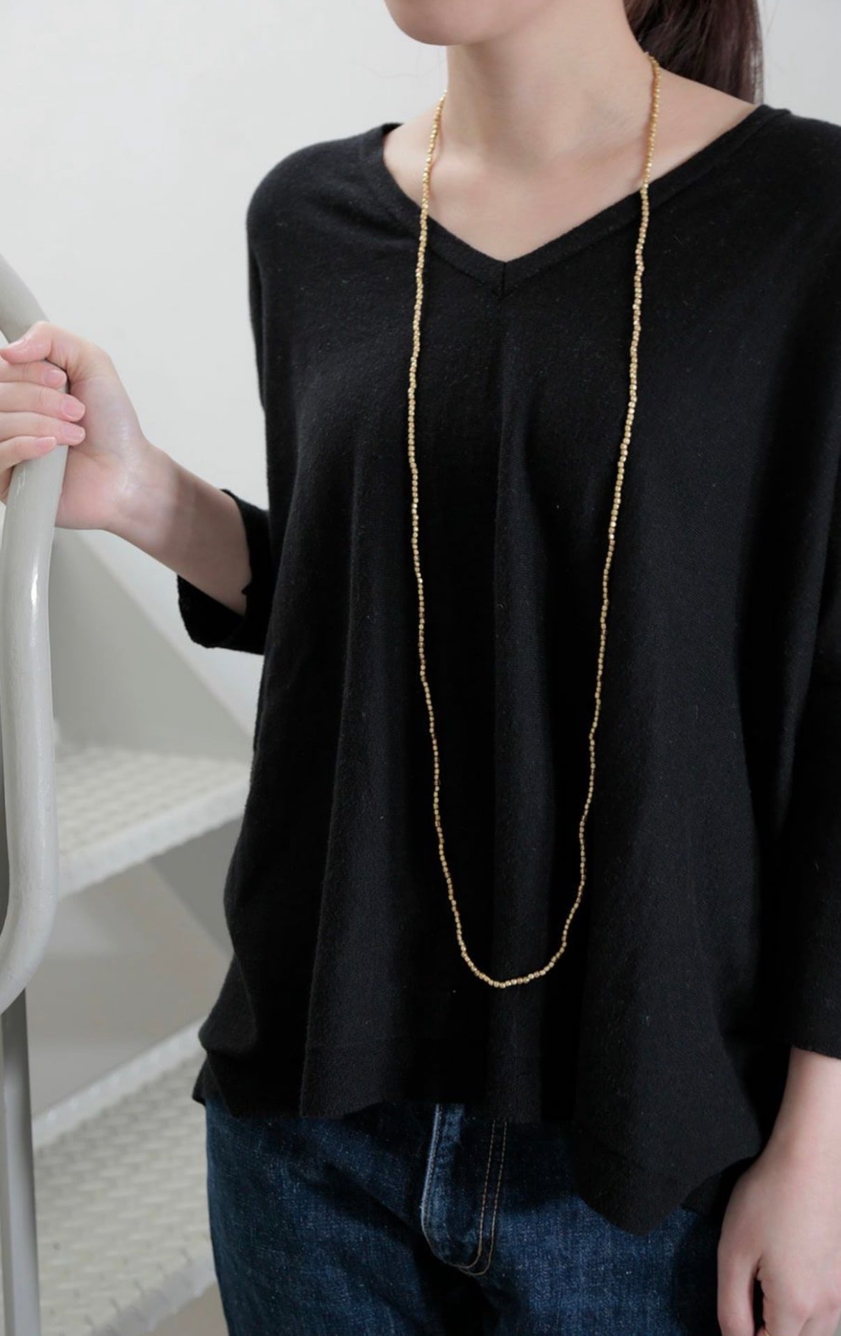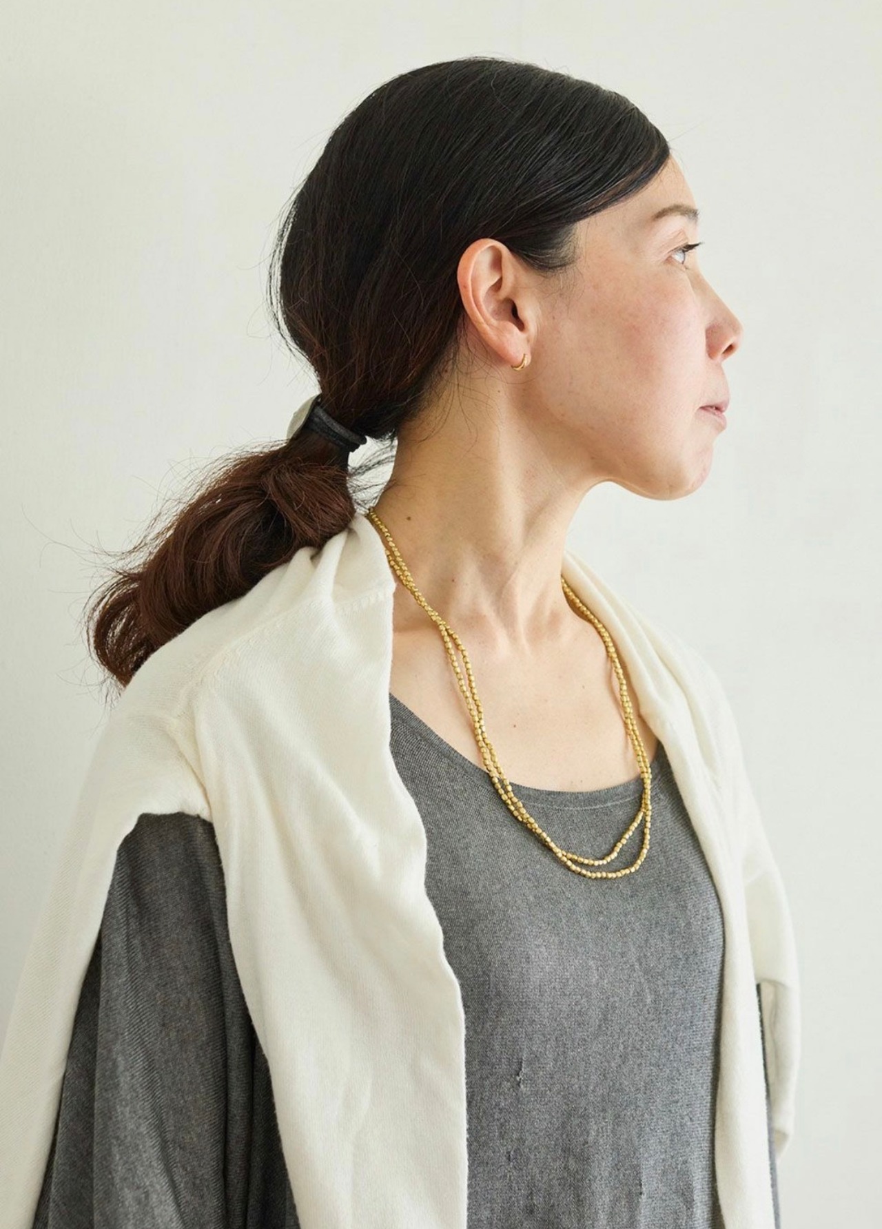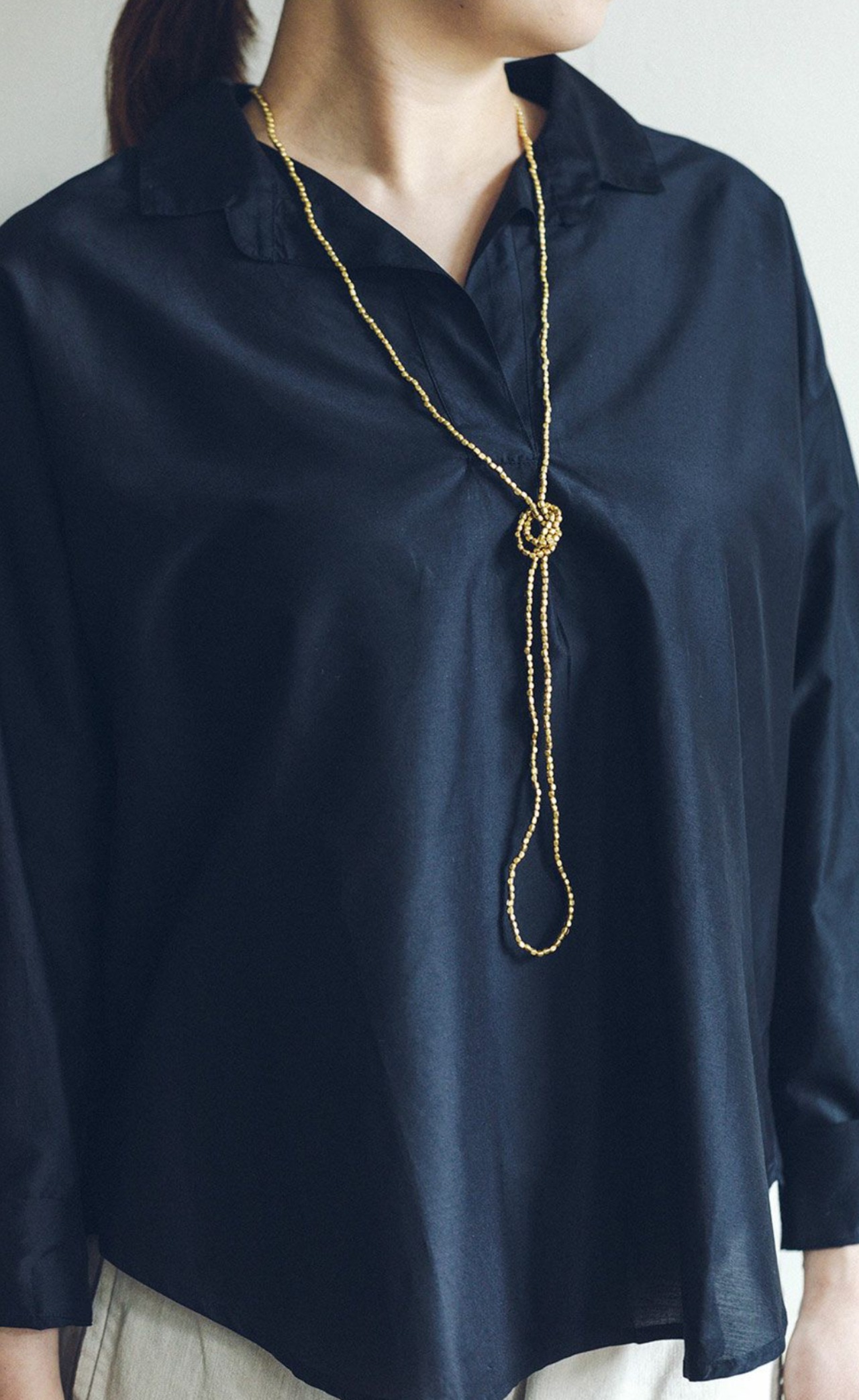 ロングタイプのネックレスは、ダブルにして首元を華やかに彩ったり、何重にもしてブレスレットとして使ったり。コーディネートによって、いろいろな付け方をお楽しみ頂けます。シンプルにTシャツやリネンのワンピースと合わせて、デイリーにお使いください。