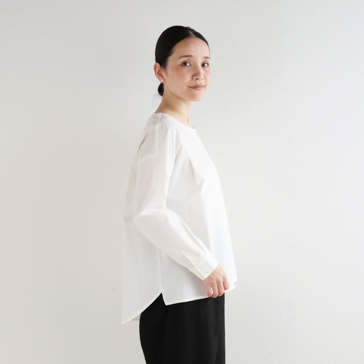 60番手のコンパクト糸を使ったタイプライター生地にベイビーリップ加工を施し、やわらかさの中にほどよいハリ・コシを感じられる生地感です。