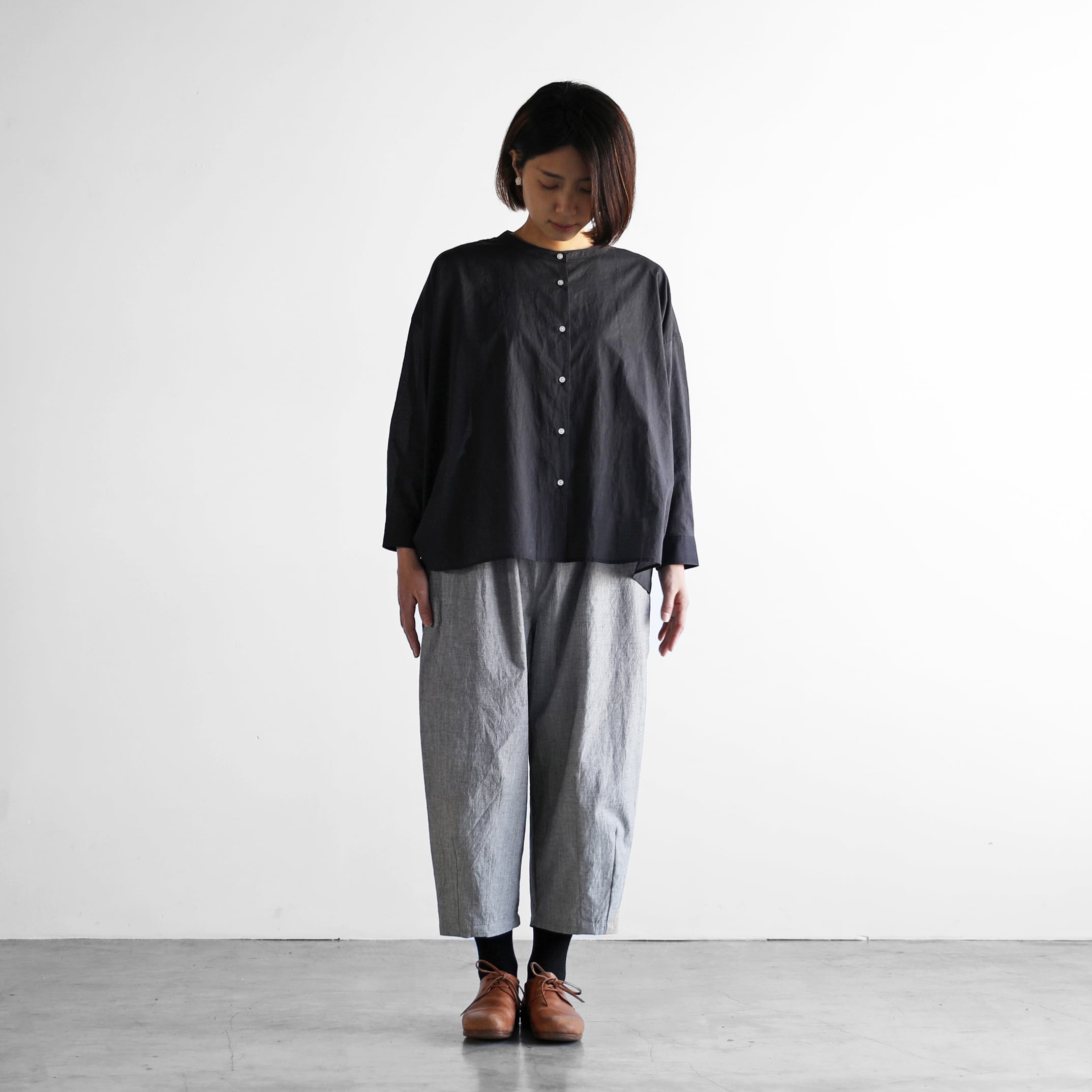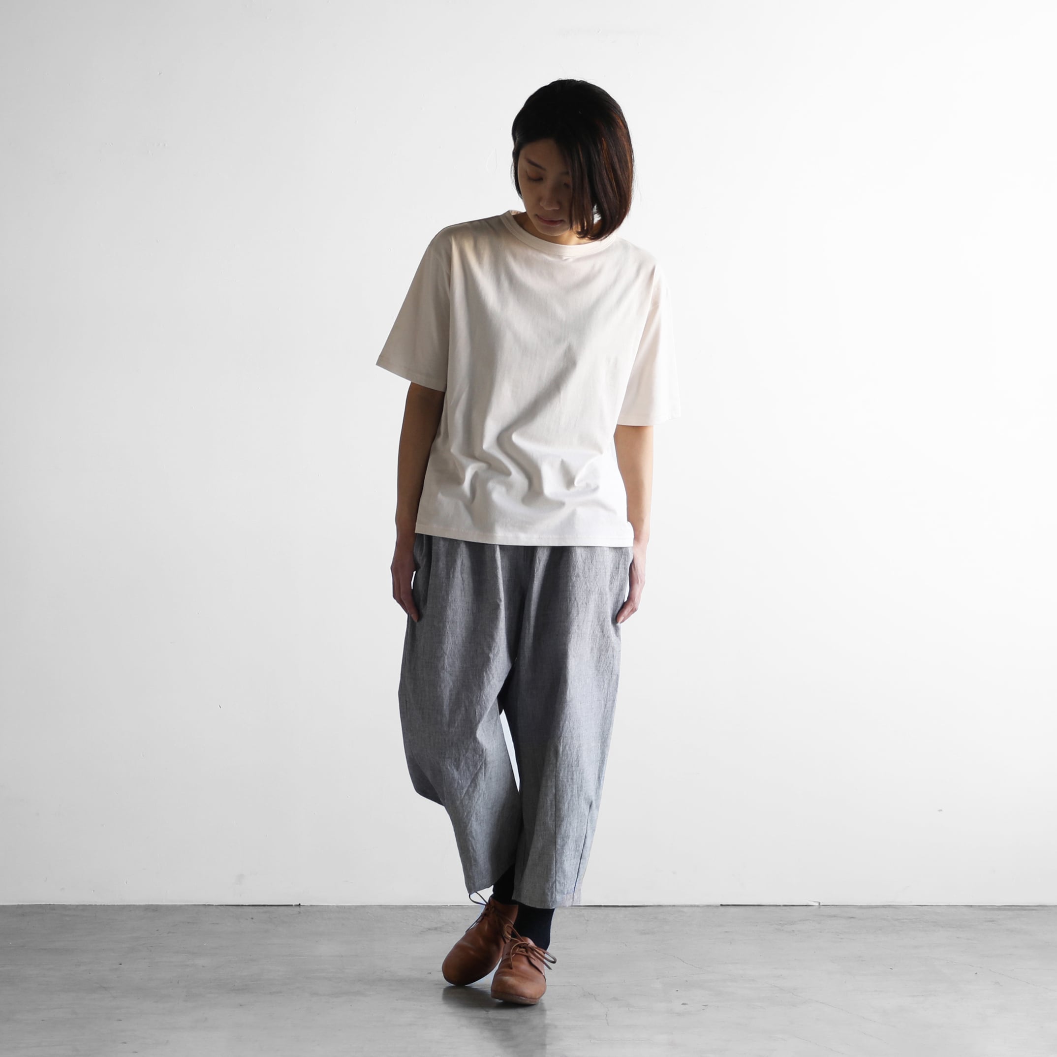 もも周りにたっぷりと生地を使用したバルーンパンツで、裾に向けてテーパードがかかったきれいなラインのシルエットです。8〜9分丈くらいの丈感で、少しロールアップして履いていただくのもおすすめです。右後ろについた下がり気味のポケットがポイント。