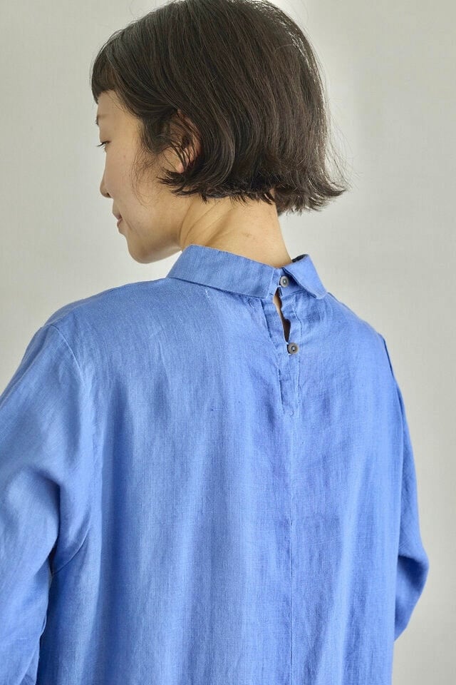 後ろ襟ぐりには小さなティアドロップあきを施し、後ろ姿にもさりげないアクセントを。