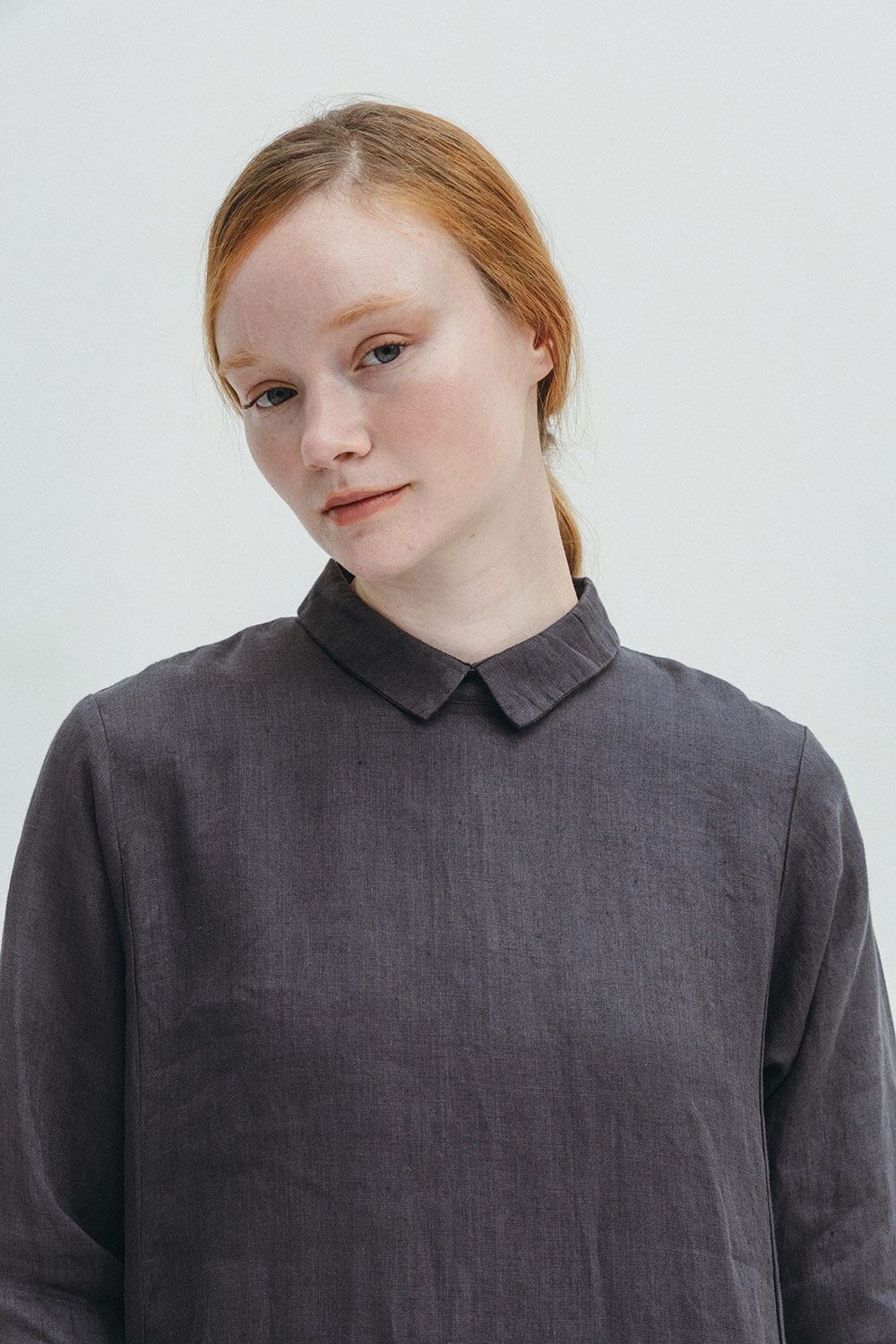 後ろ襟ぐりには小さなティアドロップあきを施し、後ろ姿にもさりげないアクセントを。