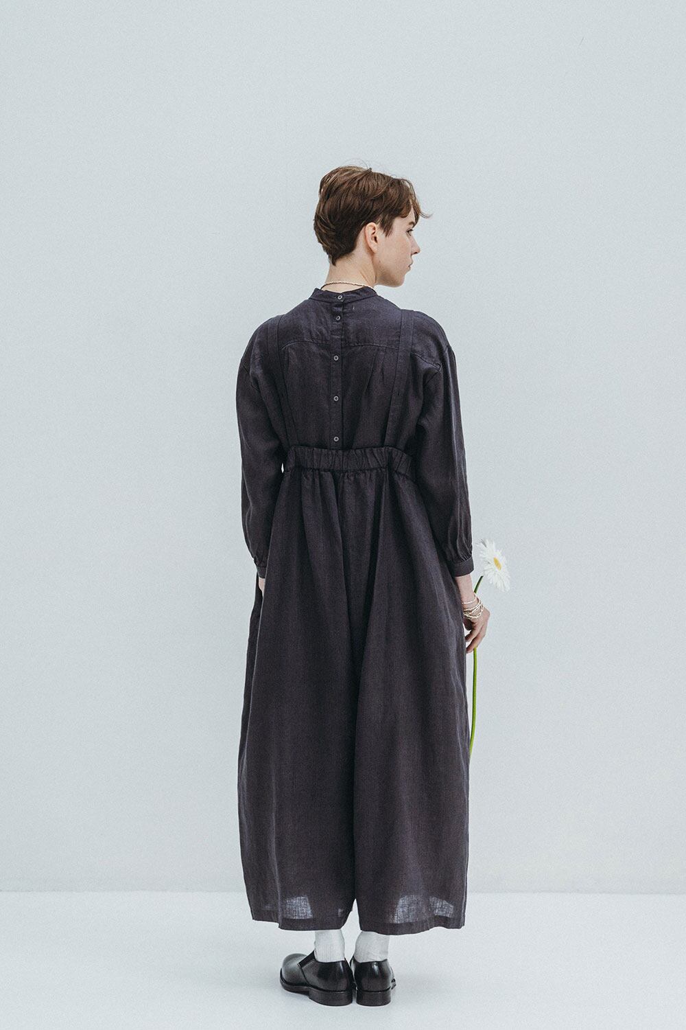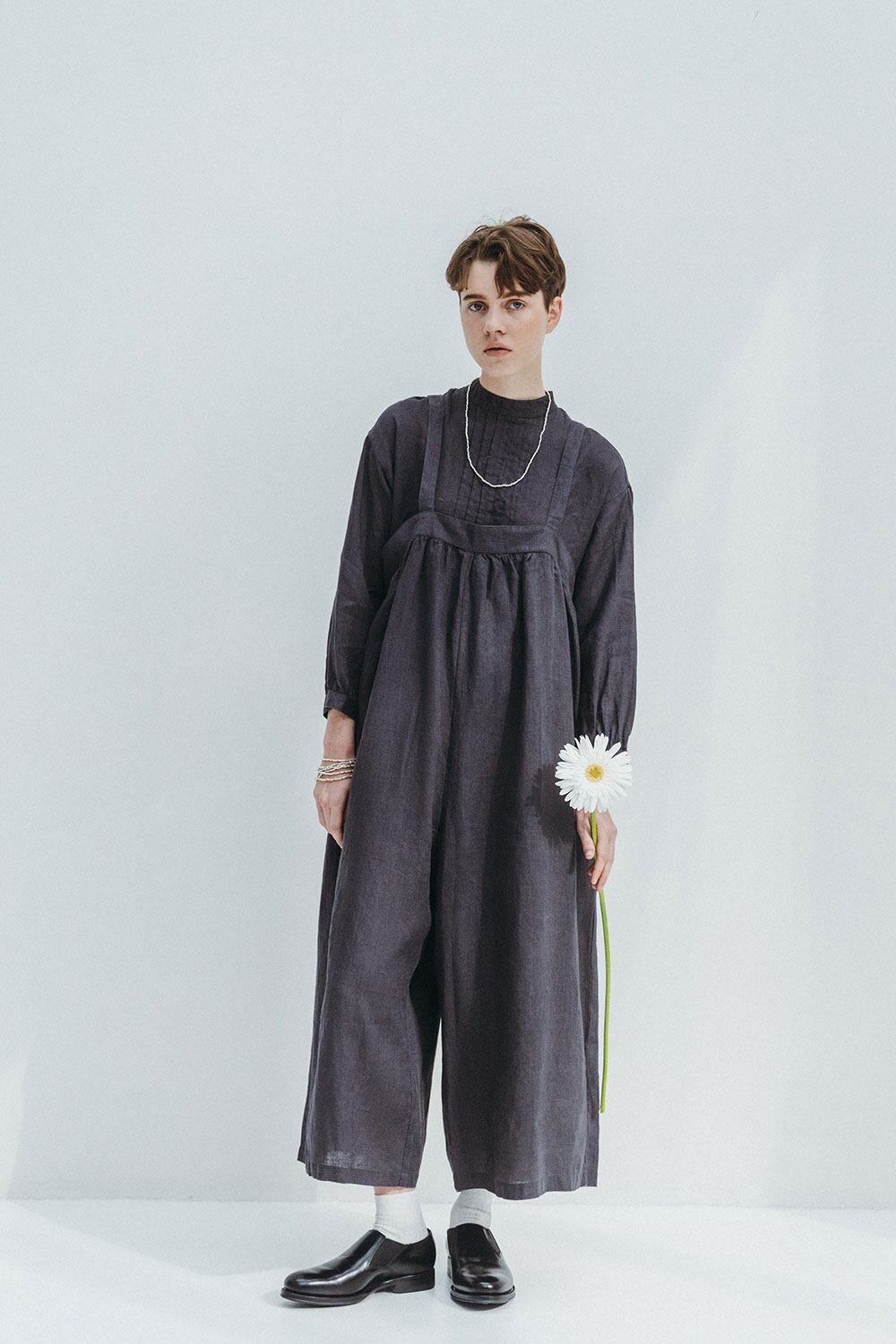フロントにギャザーを寄せ、バックスタイルにはゴムを入れたサロペット。
